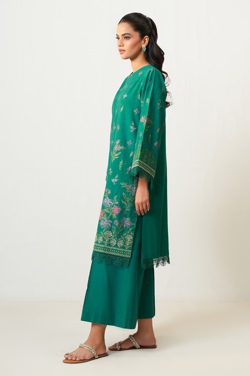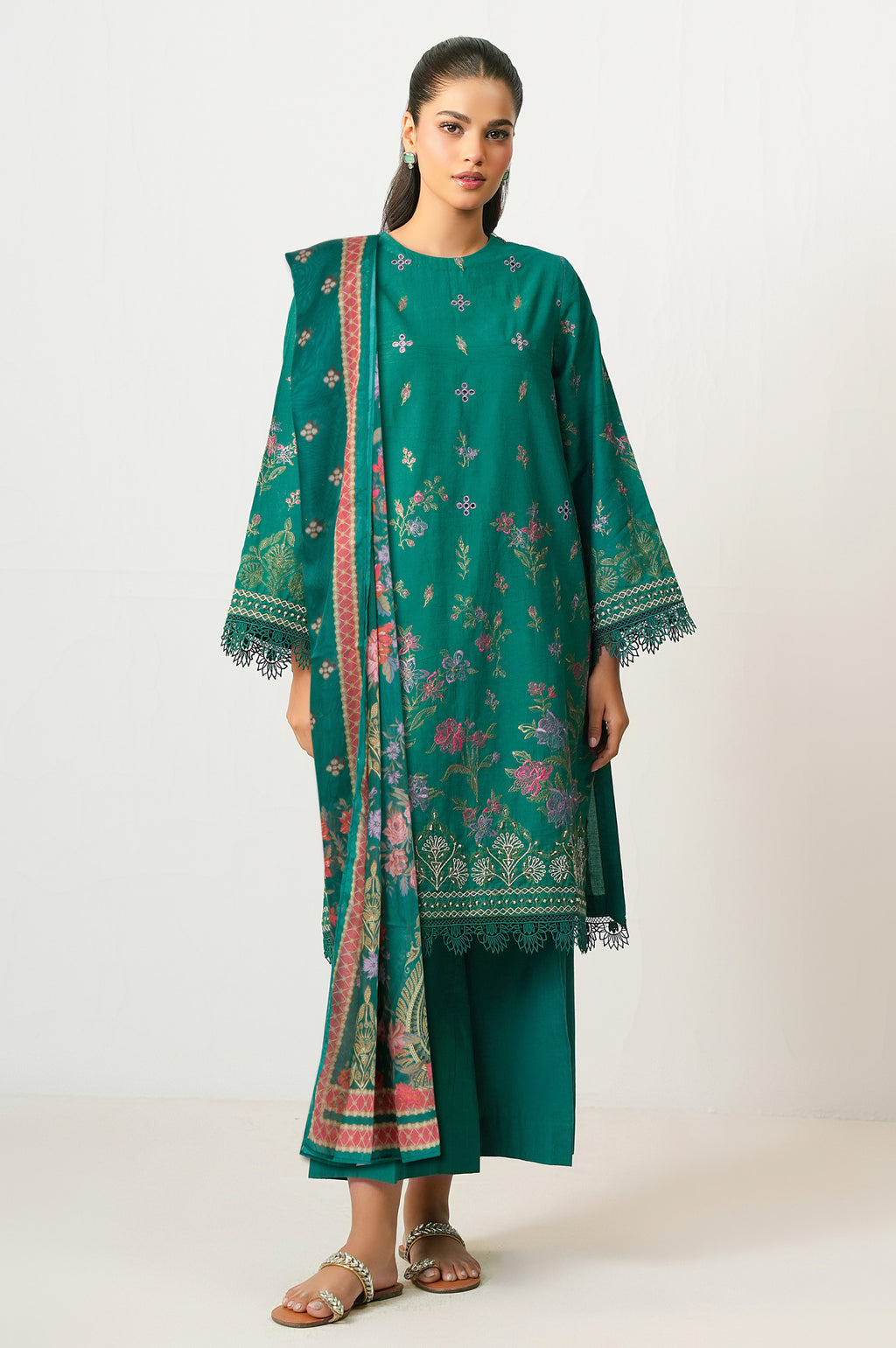 Style this classic green 3-piece lawn suit, featuring a dobby shirt embellished with delicate embroidery for timeless appeal. The rich silk dupatta brings in a luxurious finish, while the cambric trouser provides all-day comfort. This suit will have you looking effortlessly put together in all casual gatherings.