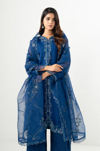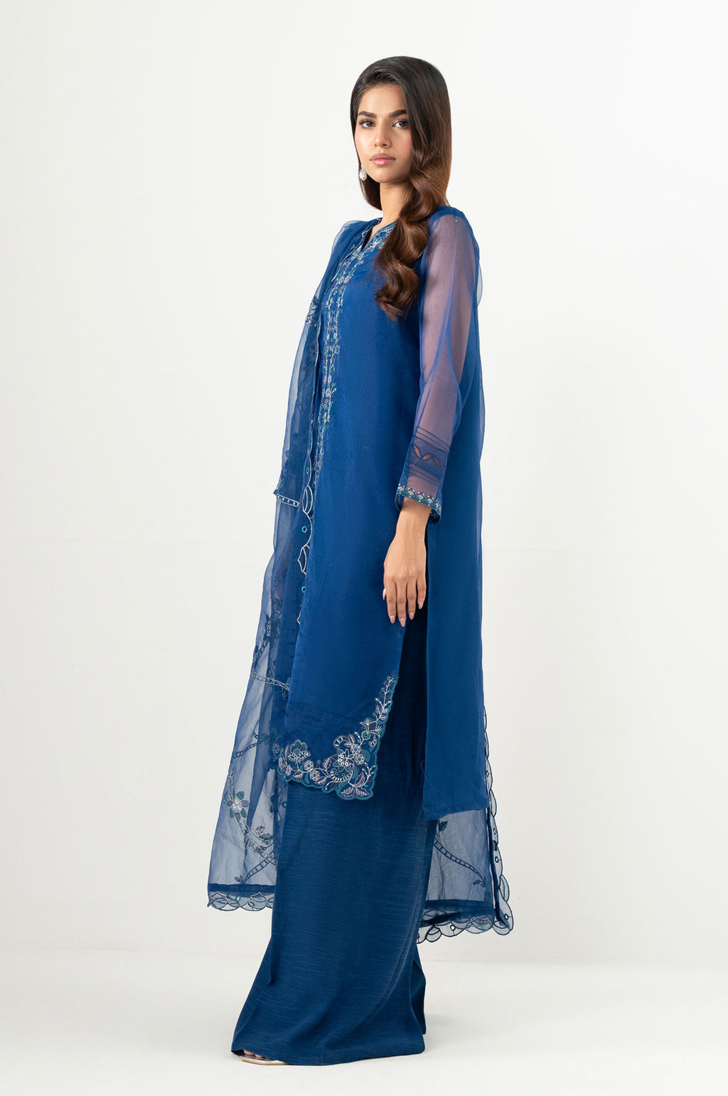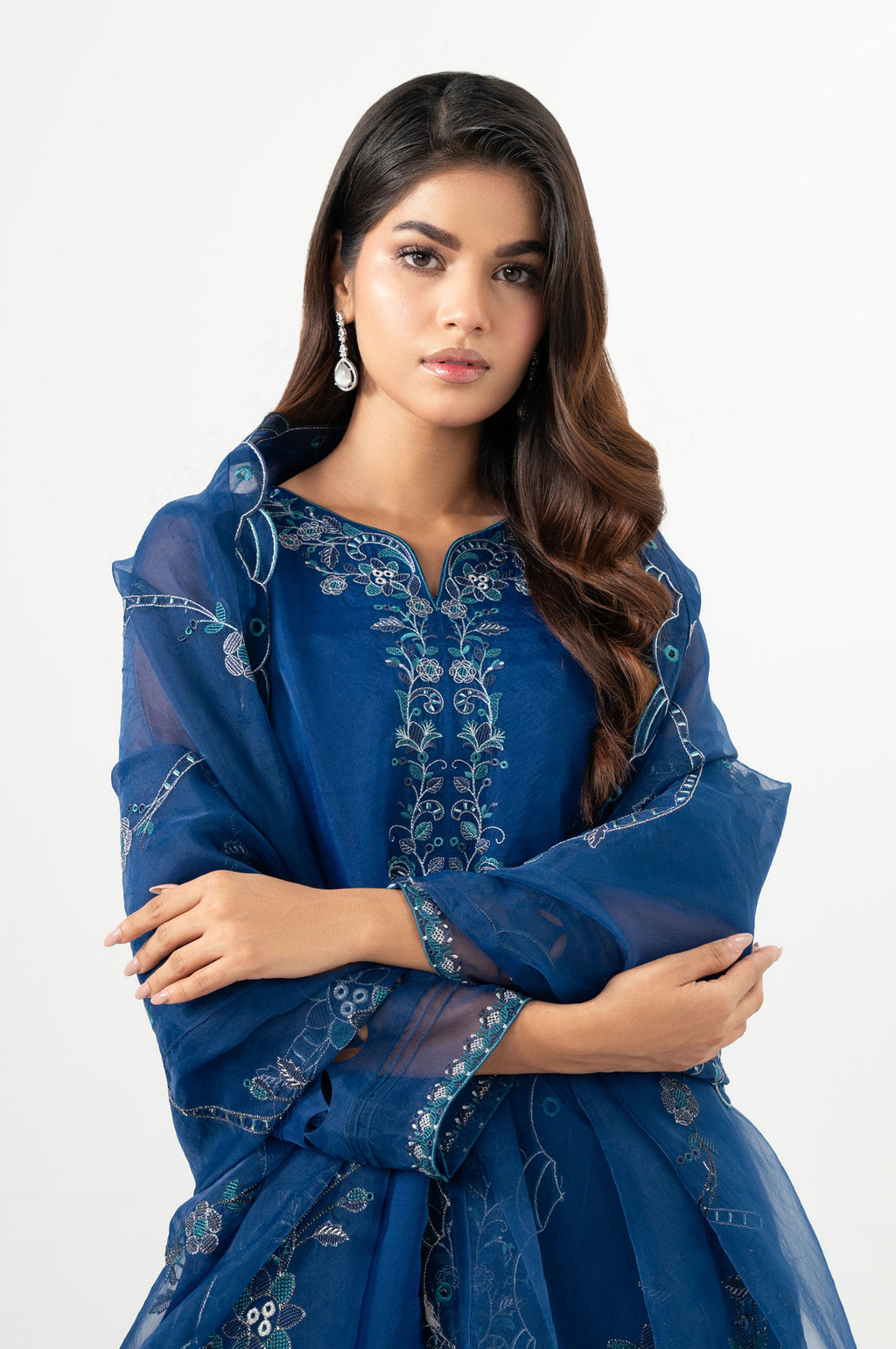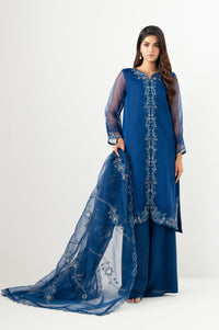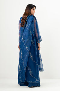 Elevate your style with this unstitched 3 Piece Embroidered Organza Suit in sapphire blue, featuring stunning Jacobean florals design inspiration. The ensemble includes intricately embroidered organza for the front, back, and sleeves, along with an elegant embroidered lace dupatta. Complete with an embroidered border for the front and lace detailing on the sleeves, this outfit exudes sophistication. Perfect for making a statement at any party or special occasion.