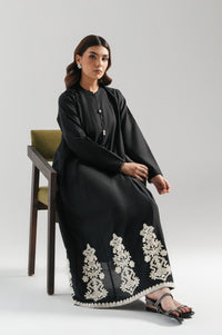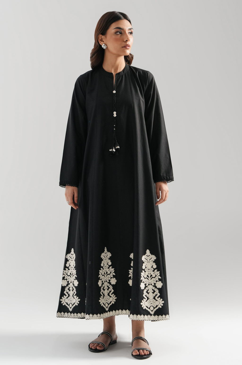 A timeless black cambric dress with intricate embroidery, perfect for casual sophistication. The A-line silhouette with panels enhances grace and movement. Designed with a flat band collar and V-slit for a structured neckline. Features full straight sleeves and a round hem adorned with linear motifs. A regular fit design that flatters every frame, ideal for refined daywear.