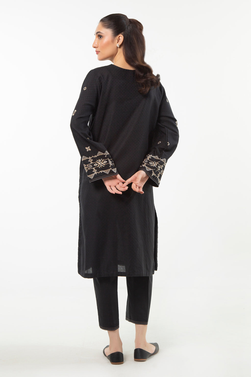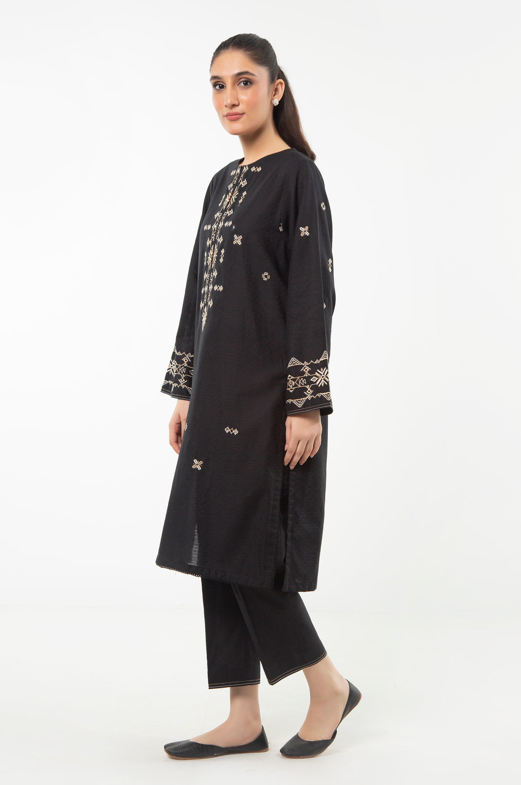 This classic 2-piece black suit features dyed embroidery on dobby fabric, exuding understated elegance. The straight shirt comes with a round neckline and slit, adding a subtle design element. Paired with dyed cambric straight pants for a clean, cohesive look. Ideal for everyday wear, office attire, or modest casual styling. Its regular fit ensures comfort without compromising on sophistication.