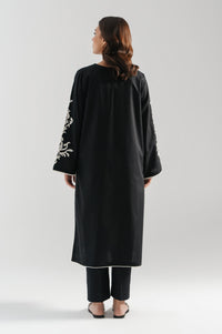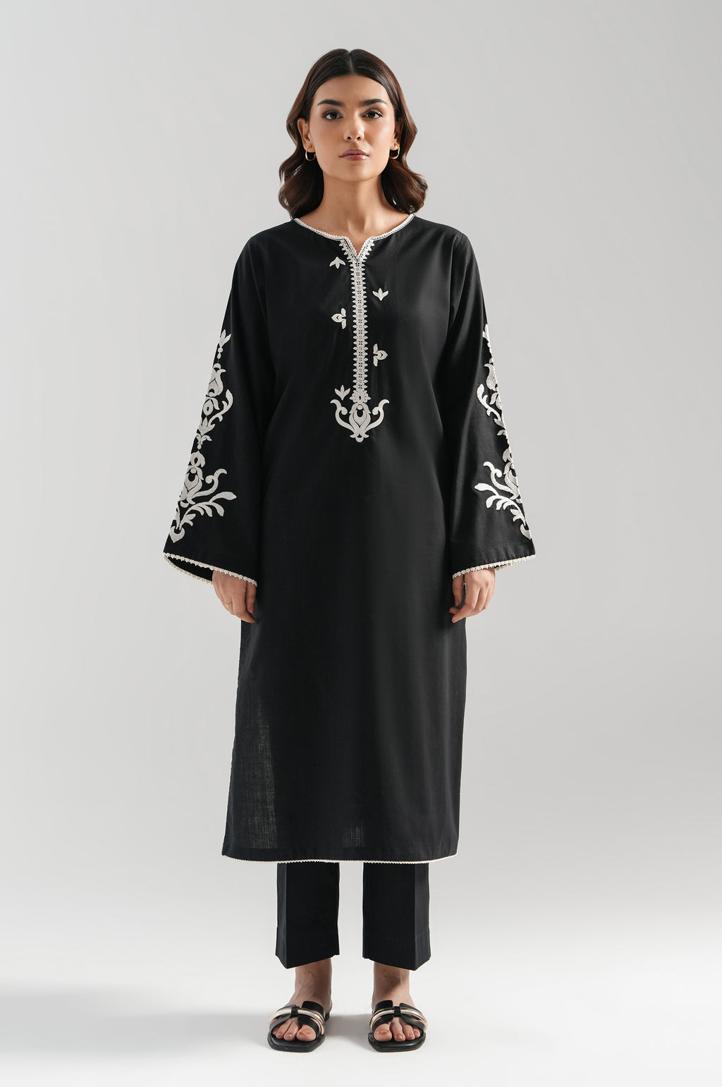 This 2-piece suit features damask embroidery design inspiration. over a soft black cotton slub canvas. A round collar with a V-slit and flared embroidered sleeves create visual interest. The regular fit straight shirt is both breathable and chic. Paired with relaxed-fit pants for casual styling and versatility.
