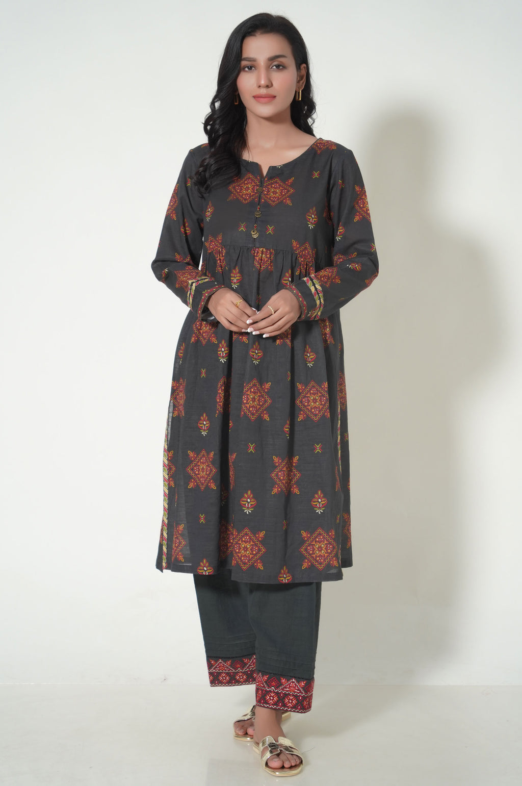 This elegant ensemble is a timeless canvas adorned with beautiful traditional prints, crafting a rich and classy composition. A black shirt and matching bottoms paired with a maroon dupatta can be a great choice for casual gatherings.