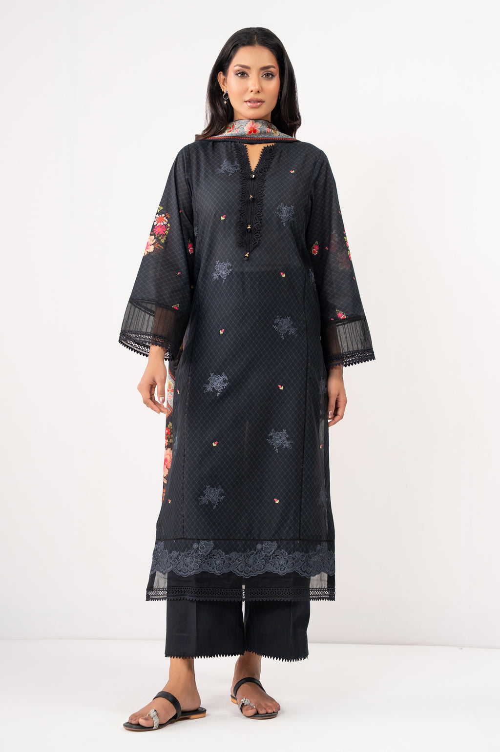 Sleek and striking, this black 3-piece lawn suit blends artistic digital prints with subtle embroidery for a bold yet refined look. The silk dupatta adds depth and flow, and the cambric trouser completes the design with classic ease. Whether worn in the evening or during a day at the office, this 3-piece set is both versatile and impactful.