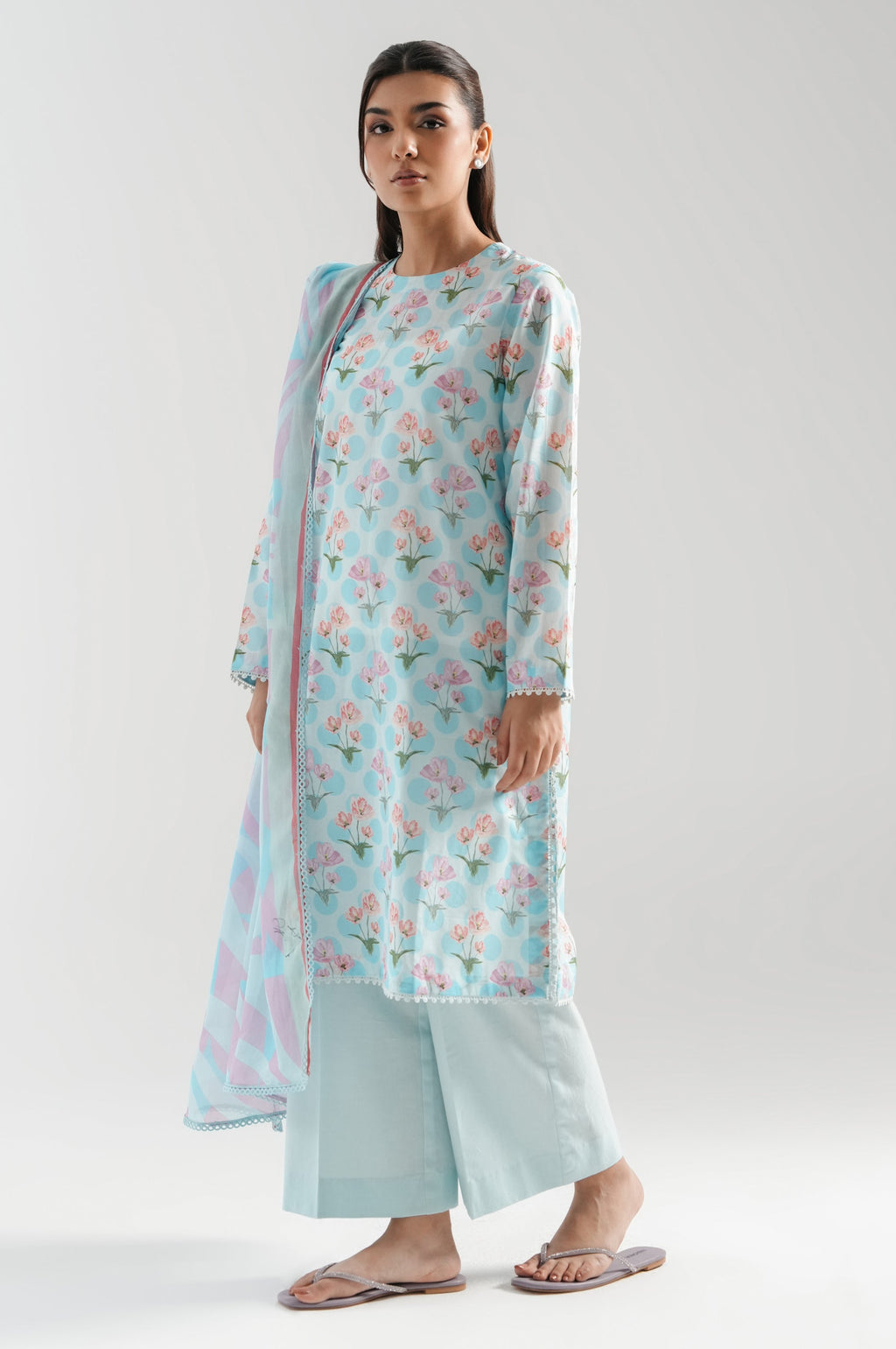 This light blue unstitched suit is a serene take on summer fashion, offering elegance through digital floral patterns. The lawn shirt is breathable and easy to wear, making it ideal for daily use. The dyed cambric trousers provide a clean finish and lasting wear. A printed lawn dupatta flows beautifully to complete the suit.