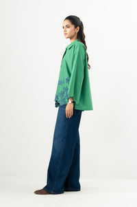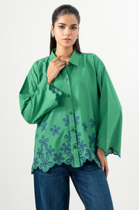 Embrace effortless style with this holly green ready to wear 1-piece cambric top. The top showcases beautiful embroidery and a straight silhouette with beautiful finish. It features a shirt collar with a placket and flared full sleeves with embroidered scallops. The straight hem and daisy motif add charm, making it ideal for casual outings.