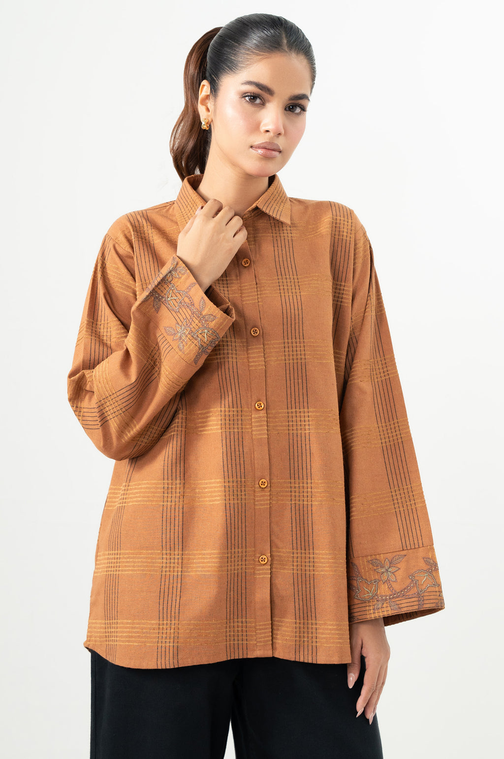 Add warmth to your wardrobe with this caramel brown, stitched 1-piece yarn-dyed top. It features intricate embroidery on the front and sleeves, a shirt collar, and full-length straight sleeves. The contemporary petal motif gives it a stylish touch, perfect for casual wear.