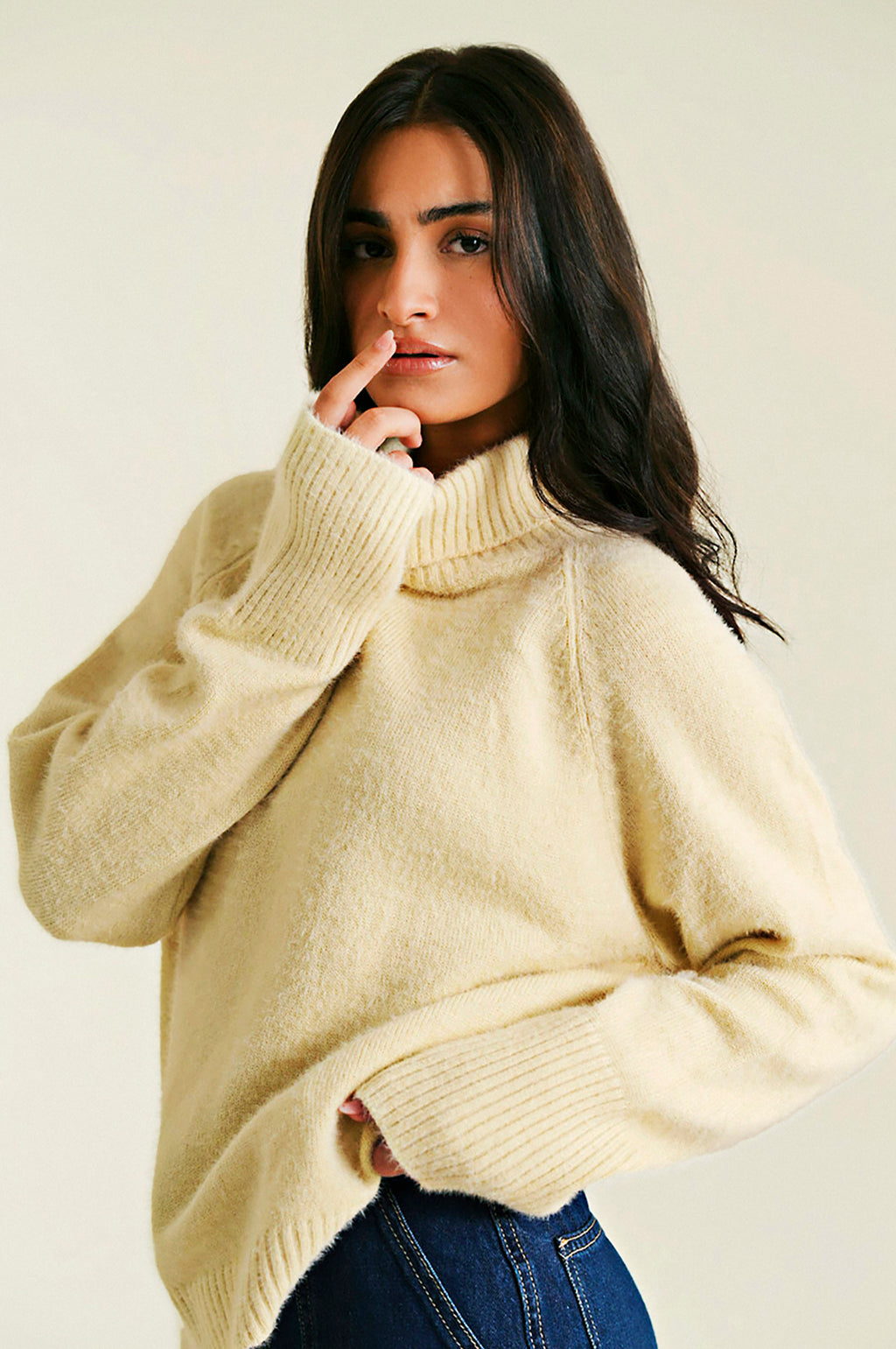 The white smart fit high neck sweater offers a blend of elegance and comfort. Crafted from a luxurious acrylic and mink mix, this mid-length yarn-dyed sweater features a high neck and long sleeves, ideal for colder weather. The round hemline adds a refined touch to this chic piece.